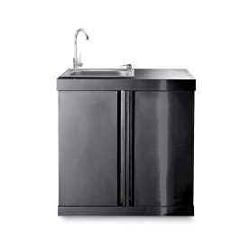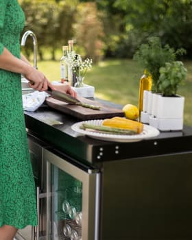 Myoutdoorkitchen-moduuli, tiskipöydällä ja säilytyskaapilla, antaa mahdollisuuden huuhdella lihat ja kasvikset, pestä kädet tai pitää työtasot puhtaina. Pesuallasmoduulissa on kätevä työtaso, jonka alla kaksi ovellista kaappia. Kaapeissa on runsaasti säilytystilaa esimerkiksi grillausvälineille, jäteastialle tai muille tarvikkeille – kaapit ovat käytännöllinen ja tyylikäs säilytysratkaisu.